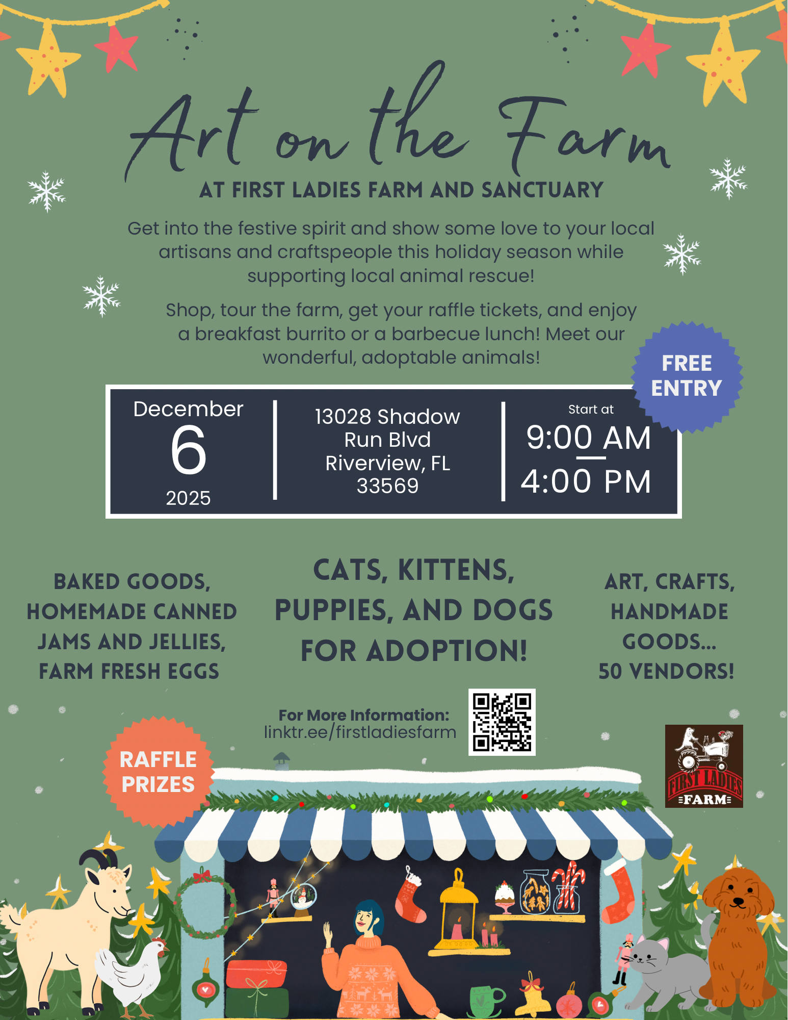 Come out to First Ladies Farm and Sanctuary to get a jump start on your holiday shopping while supporting both animal rescue and local artists, crafters, and other artisans.